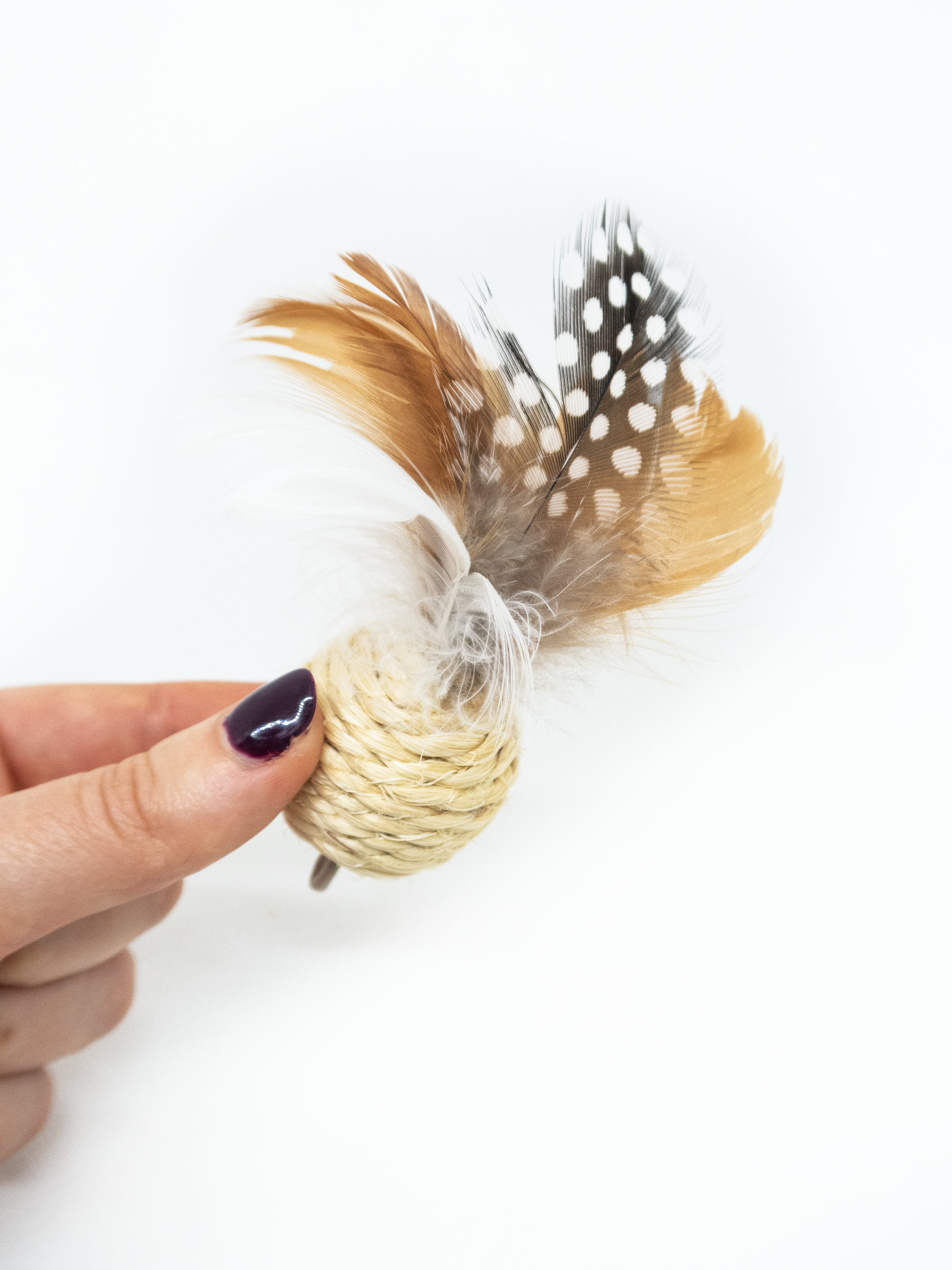 La crazycanne avec sa boule en corde sisal et ses plumes naturelles